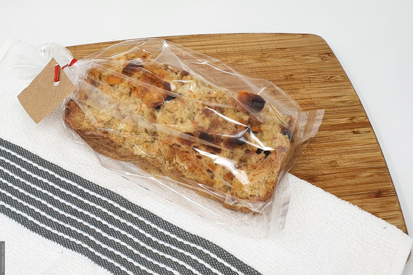 Budín elaborado con nuestro pan, queso y pasas, con un suave sabor dulce a leche y mantequilla. Barra de 18cm
